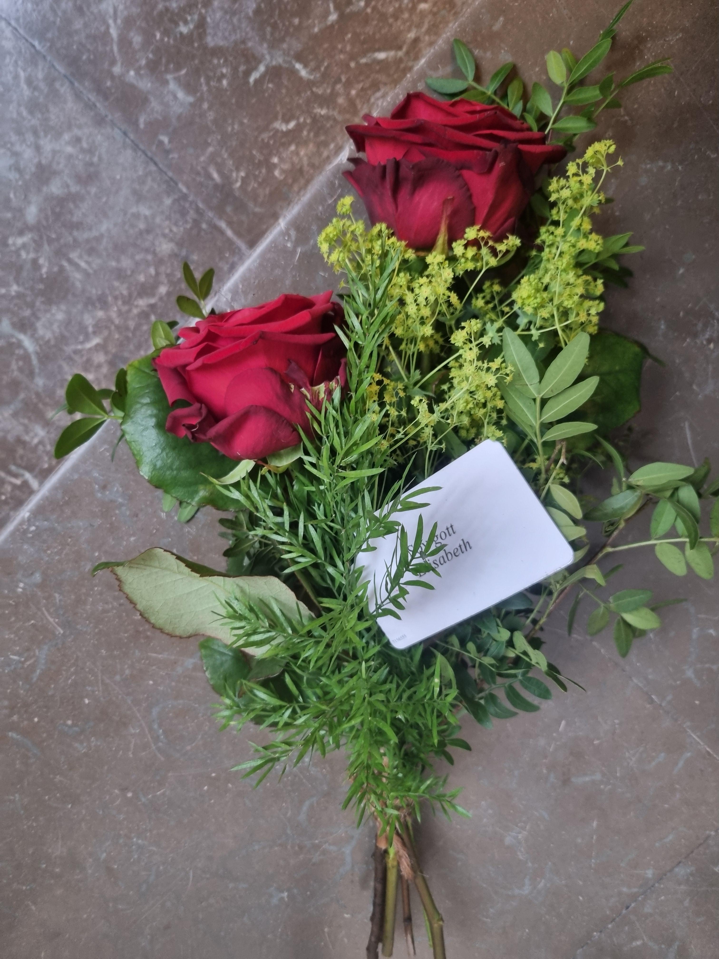 Handbukett Nr. 2405. Med röda Rosor, limekvist med blandat grönt.